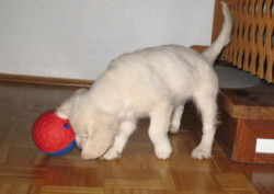 Inzwischen bin ich schon bald 8 Monate alt. Ich bin schon richtig groß und wiege ungefähr 28 Kilo. Ich bin nach wie vor sehr wild, wenn ich draußen bin, aber im Haus ruhig und ausgeglichen. Ich kann schon gut alleine bleiben, und auch andere Leute besuchen. Über Ostern war ich bei meinen Züchtern und meiner Familie, ganze zwei Wochen lang. Das war schön!