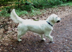 ich habe ja lange nichts geschrieben. Inzwischen bin ich schon fast 15 Monate alt und eine wunderhübsche, leicht cremefarbige Hündin geworden. Ich bin sehr lebhaft und rase durch Wald und Flur, dass es Ute Hören und Sehen vergeht. Dabei soll ich das eigentlich nicht, denn leider habe ich ziemlich schlechte Hüft- und Ellenbogengelenke, wie sich beim routinemäßigen Röntgen heraus gestellt hat. Aber schonen möchte ich mich wirklich nicht, schließlich muss ich meinem Spitznamen „Wilde Zora“ ja gerecht werden. Selbst wenn Ute über meine Raserei nicht so glücklich ist, sagt sie doch „besser ein vergnügtes kürzeres Leben als eine depressive Hündin“ – und festhalten kann sie mich ja sowieso nicht, dazu bin ich viel zu schnell und zu lebhaft.